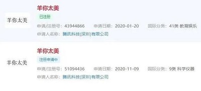 近日,騰訊又有新動作——騰訊科技(深圳)有限公司新增多條商標信息,商標名為“羊你太美”,國際分類涉及教育娛樂與科學儀器,其中前者已完成注冊,后者還在申請階段。