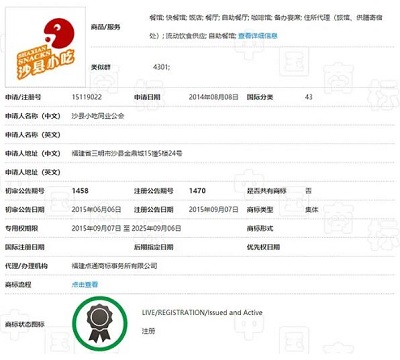典型的集體商標,那非“沙縣小吃”不可。沙縣小吃同業公會1998年注冊了“沙縣小吃”服務商標,2006年又注冊了“沙縣小吃同業公會及圖形”集體商標,審定服務項目為餐館、飯館、流動飲食供給、咖啡館、雞尾酒會服務等。