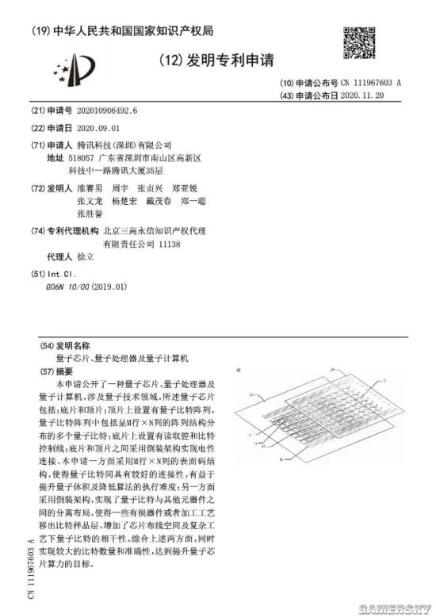 近日,有消息報道稱騰訊提交的諸多專利申請中有一份顯示為“量子芯片、量子處理器及量子計算機”,從查詢到的專利信息摘要上可以看到相關(guān)內(nèi)容。