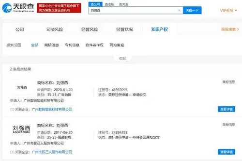 天眼查App顯示,“劉強西”和“章小天”已被注冊商標。今年1月,廣州數(shù)銳智能科技有限公司申請注冊“劉強西”的商標,商標國際分類為廣告銷售,該商標已于今年9月公示為“已注冊”。