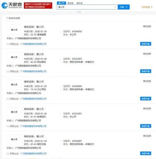 此外,廣州數(shù)銳智能科技有限公司還申請注冊了“章小天”的商標,商標國際分類涉及網(wǎng)站服務(wù)、辦公用品、教育娛樂、餐飲住宿、廣告銷售等,申請日期均在今年1月,商標狀態(tài)多數(shù)顯示為“已注冊”。