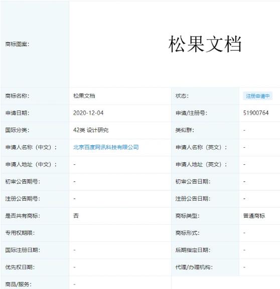 企查查APP顯示,北京百度網訊科技有限公司于12月4日申請注冊“松果文檔”商標,涉國際分類設計研究,狀態為“注冊申請中”,此前該公司于2019年注冊申請相關商標。