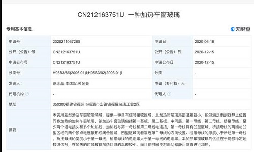據(jù)天眼查APP顯示,福耀玻璃工業(yè)集團(tuán)股份有限公司公布一項名稱為“一種加熱車窗玻璃”的專利,該專利摘要顯示“本加熱車窗玻璃的優(yōu)點在于能夠穩(wěn)定地接收信號,在加熱的時候玻璃加熱區(qū)域的溫差較小,而且能夠同步對雨刮器靜止位置進(jìn)行加熱。”專利申請日為2020年6月16日,申請公布日為2020年12月15日。