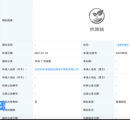 企查查知產(chǎn)信息顯示,京東此前曾申請多條“京源鏈”商標(biāo)圖案和名稱,國際分類涉設(shè)計研究、運輸貯藏、廣告銷售等。據(jù)悉,針對農(nóng)產(chǎn)品方面的信任問題,京東物流此前推出了基于區(qū)塊鏈技術(shù)的“京源鏈”產(chǎn)品,通過結(jié)合大數(shù)據(jù)、物聯(lián)網(wǎng)、GIS地圖、區(qū)塊鏈等技術(shù)和設(shè)備,實現(xiàn)了農(nóng)產(chǎn)品的全程信息可視化追溯,并按照“一物一碼”標(biāo)準(zhǔn),實現(xiàn)溯源信息的公開和透明。