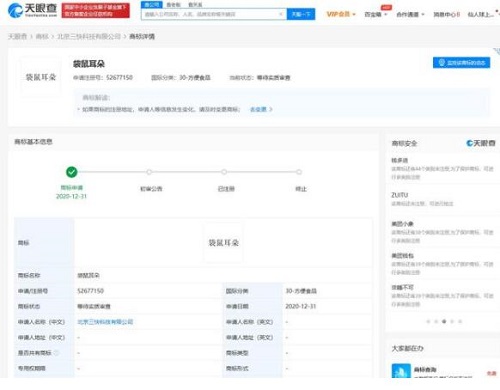 北京三快科技有限公司于近日申請注冊“袋鼠耳朵”商標,涉及國際商標注冊分類有紐扣拉鏈、食品、方便食品,目前商標狀態(tài)為等待實質(zhì)審查、商標申請中。
