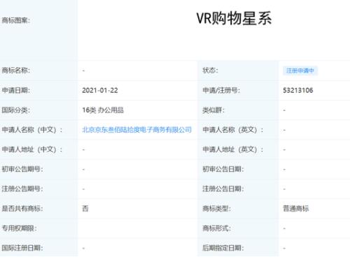 近日,北京京東叁佰陸拾度電子商務有限公司申請“VR購物星系”商標,國際商標注冊分類為16類 辦公用品,商標狀態為“注冊申請中”。