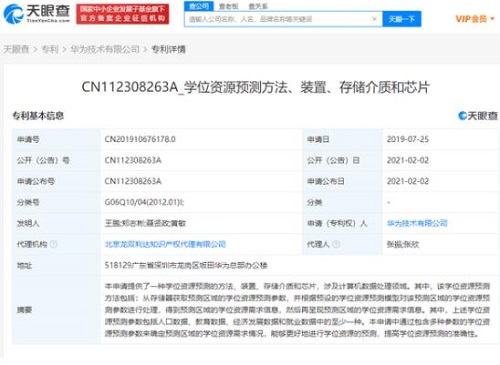 2月2日,華為技術(shù)有限公司公開了名為“學(xué)位資源預(yù)測方法、裝置、存儲介質(zhì)和芯片”發(fā)明專利,該專利公開號為“CN112308263A”。