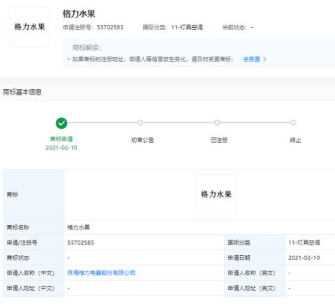 近日珠海格力電器股份有限公司申請注冊“格力水果”商標,申請日期為2021年2月10日,涉國際商標分類為11-燈具空調,商標狀態顯示為“商標申請中”。