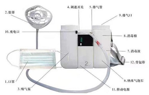 據(jù)悉,該實(shí)用新型口罩,一次性口罩為濾體,敷于透氣臉罩上,其臉罩內(nèi)安裝一吸管,吸管的另一端連接微型吸氣泵進(jìn)口,吸氣泵出口管的另一端接入納米氣泡石,氣泡石放入消毒液容器底部,容器下半部是消毒液,上半部是消毒棉,所有部件裝入背包,方便病人站立或出行時(shí)使用,病人呼出的氣體及病毒注入消毒液及消毒棉后,在浮出過程中病毒被殺死。