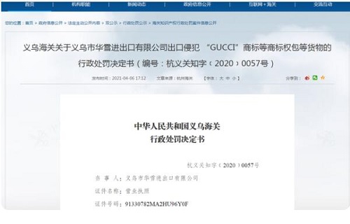 4月6日,浙江義烏海關(guān)發(fā)布關(guān)于義烏市華雪進(jìn)出口有限公司(以下簡(jiǎn)稱:義烏華雪進(jìn)出口公司)出口侵犯“GUCCI”商標(biāo)等商標(biāo)權(quán)包等貨物的行政處罰決定書。