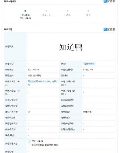 近日,百度在線網(wǎng)絡(luò)技術(shù)(北京)有限公司新增“知道鴨”商標(biāo)申請信息,國際分類為設(shè)計研究,商標(biāo)狀態(tài)為“注冊申請中”。