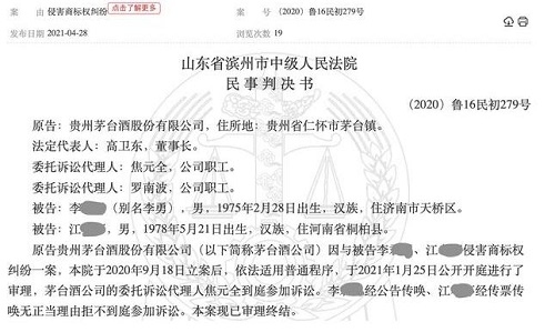 4月28日,貴州茅臺酒股份有限公司與李某、江某侵害商標權糾紛一審民事判決書公布,案號(2020)魯16民初279號,審理法院為山東省濱州市中級人民法院,原告貴州茅臺酒股份有限公司,被告李某、江某。