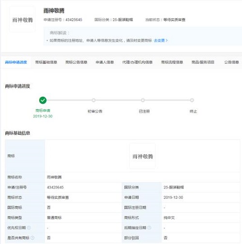 “雨神敬騰”商標已被申請注冊,申請人為南京崇榮電子商務有限公司,國際分類為服裝鞋帽,當前商標狀態為“等待實質審查”。