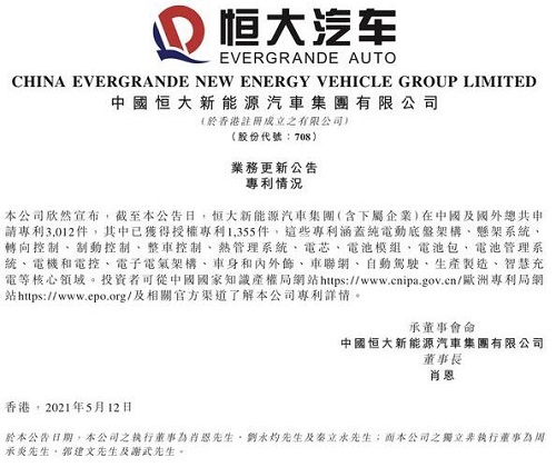 在上海車展九車齊發后,5月12日,恒大汽車上市公司發布公告稱,目前恒大新能源汽車集團(含下屬企業)已經在中外共計申請專利3012件,并已經獲得授權專利1355件。這些專利涵蓋多個關鍵部件、電池電控以及智能網聯等核心領域。