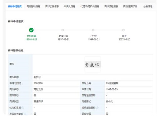 “老友記”商標已被多家公司及自然人申請注冊,國際分類涉及服裝鞋帽、食品、廣告銷售、飼料種籽等,申請人包括華納兄弟娛樂公司、大埔巴蒂制衣有限公司、優酷網絡技術(北京)有限公司等。該商標最早申請日期為1996年5月,由大埔巴蒂制衣有限公司申請注冊,國際分類為服裝鞋帽,目前商標狀態為“無效”。