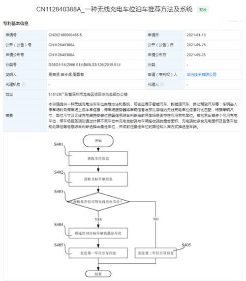 5月25日,華為技術有限公司公開“一種無線充電車位泊車推薦方法及系統”專利,公開號為CN112840388A。