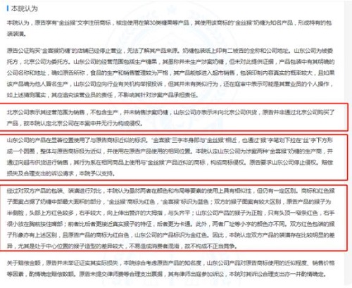 本案裁判結果為,本判決生效后,被告山東匯福園食品有限公司停止在其奶糖產品的包裝上使用與原告的“金絲猴”商標近似的“金喜猴”標識并賠償原告經濟損失及合理支出3萬元等。