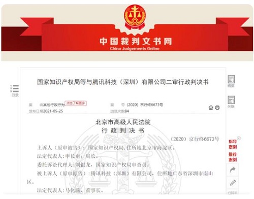 近日,北京市高級人民法院公布了國家知識產權局等與騰訊科技(深圳)有限公司二審行政判決書。