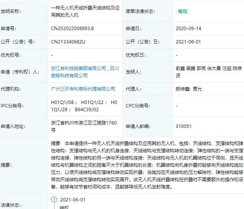 6月1日,浙江吉利控股集團(tuán)有限公司獲得“一種無人機(jī)天線折疊天線結(jié)構(gòu)及應(yīng)用其的無人機(jī)”發(fā)明專利授權(quán),公告號CN213340682U,申請日期為2020年9月,申請人為浙江吉利控股集團(tuán)有限公司、四川傲勢科技有限公司。