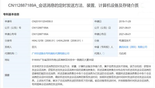 近日,騰訊科技(深圳)有限公司公開“會話消息的定時發送方法、裝置、計算機設備及存儲介質”發明專利,公開號CN112887189A,申請日期為2019年11月。
