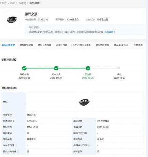 “德云女孩”商標(biāo)已被多家公司及自然人申請(qǐng)注冊(cè),申請(qǐng)人包括杭州臉枕科技有限公司、谷德亮等,國(guó)際分類涉及樂器、方便食品、飼料種籽等,商標(biāo)狀態(tài)多為“商標(biāo)已注冊(cè)”“等待實(shí)質(zhì)審查”。