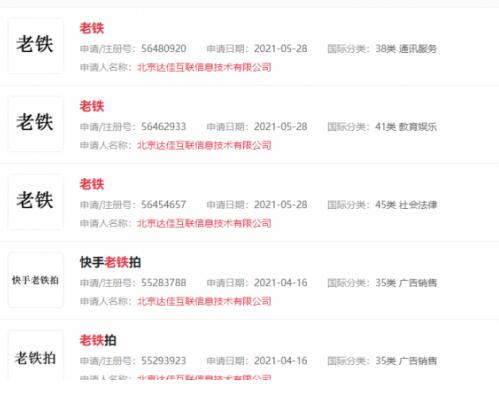 快手關聯公司北京達佳互聯信息技術有限公司曾于2017年申請注冊老鐵商標,目前已有38項申請通過,商標狀態為已注冊。