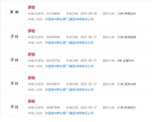 中國貴州茅臺酒廠(集團)有限責任公司于5月17日申請注冊多個茅粉商標,國際分類包含25類 服裝鞋帽、6類 金屬材料、21類 廚房潔具、41類 教育娛樂等。