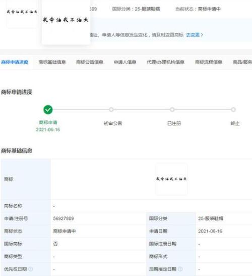 6月16日,歐某申請(qǐng)注冊(cè)“我命油我不油天”商標(biāo),注冊(cè)號(hào)為56927809,國際分類為服裝帽,商標(biāo)狀態(tài)為“商標(biāo)申請(qǐng)中”。