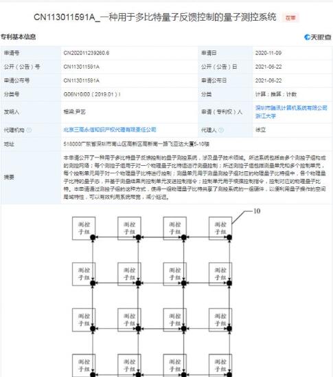 6月22日,深圳市騰訊計算機系統有限公司公開“一種用于多比特量子反饋控制的量子測控系統”發明專利,公開號為CN113011591A,申請日期為2020年11月。