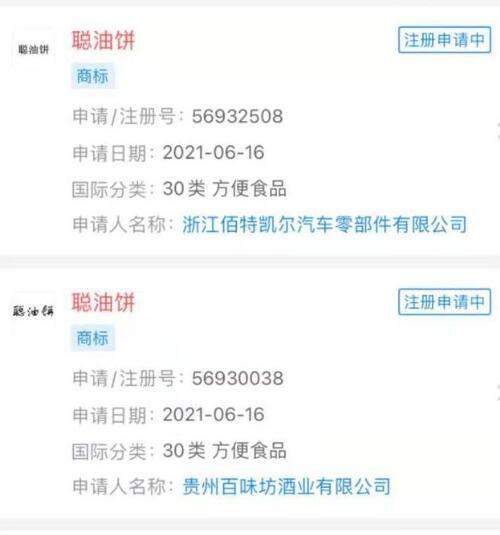 “聰油餅”被多家公司申請注冊商標,國際分類涉及食品、廣告銷售、餐飲住宿等,商標狀態(tài)為注冊申請中。