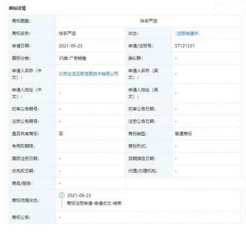 近日,快手關聯公司北京達佳互聯信息技術有限公司新增“快手嚴選”商標申請信息,國際分類涉及廣告銷售,目前商標狀態為“注冊申請中”。