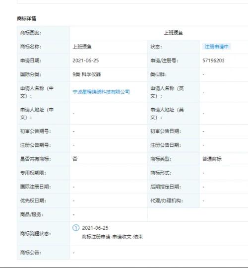近日,寧波星程錦繡科技有限公司申請(qǐng)注冊(cè)“上班摸魚(yú)”商標(biāo),國(guó)際分類涉9類 科學(xué)儀器,目前商標(biāo)狀態(tài)為“注冊(cè)申請(qǐng)中”。