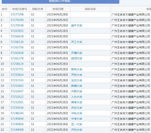 廣州王老吉大健康產業有限公司(以下簡稱王老吉公司)近日申請注冊了新婚大吉、端午大吉、開工大吉、新年大吉、生日大吉、中秋大吉、中考大吉等商標。這些商標國際分類為啤酒飲料,目前商標狀態均為申請中。