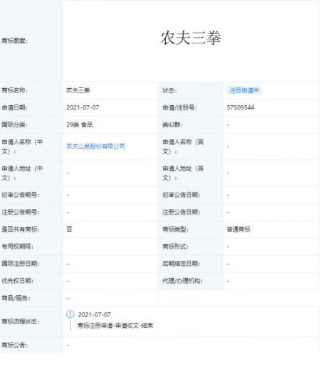 近日,農夫山泉(09633.HK)新增“農夫三拳”商標申請信息,國際分類涉及食品、方便食品,當前商標狀態均為“注冊申請中”。