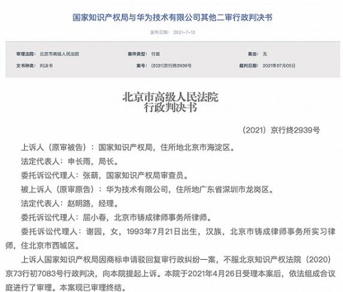 據北京法院審判信息網消息,7 月 13 日,國家知識產權局與華為技術有限公司其他二審行政判決書公開,案號(2021)京行終 2939 號,審理法院為北京市高級人民法院,裁判結果為駁回上訴,維持原判。