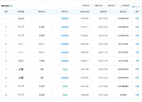 近日,北京德云社文化傳播有限公司申請注冊“郭德綱”商標(biāo),現(xiàn)國際分類為餐飲住宿,當(dāng)前商標(biāo)狀態(tài)為“注冊申請中”。另外,該公司還注冊過“云雷”,“張?jiān)评?rdquo;等商標(biāo)。