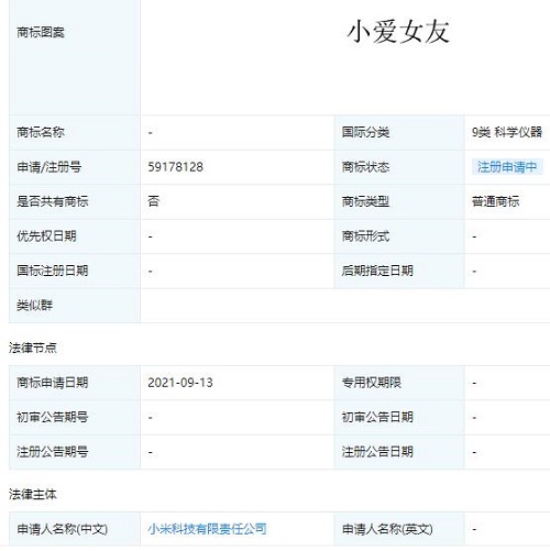 近日,小米科技有限責(zé)任公司申請注冊小愛女友商標,國際分類涉9類科學(xué)儀器,目前商標狀態(tài)為注冊申請中。