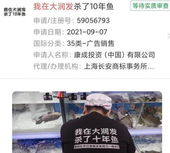 大潤發所屬公司康成投資(中國)有限公司申請網梗“我在大潤發殺了十年魚”商標,商標國際分類為35類廣告銷售,商標狀態為等待實質審查。