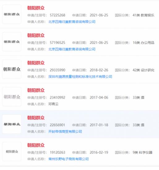 朝陽(yáng)群眾已被多方申請(qǐng)注冊(cè)成商標(biāo),國(guó)際分類(lèi)包括設(shè)計(jì)研究、餐飲住宿等,目前商標(biāo)狀態(tài)多為無(wú)效。今年6月,北京一家公司申請(qǐng)注冊(cè)辦公用品、教育娛樂(lè)類(lèi)朝陽(yáng)區(qū)群眾商標(biāo),目前該商標(biāo)狀態(tài)為注冊(cè)申請(qǐng)中。