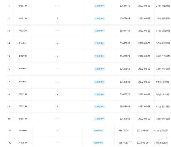 就在不久前的3月29日期間,中國廣電集團(tuán)公司一口氣報(bào)送了共計(jì)12項(xiàng)商標(biāo)注冊申請信息,其中包含了一項(xiàng)簡體中文商標(biāo)“中國廣電”、一項(xiàng)英文商標(biāo)“Broadnet”、一項(xiàng)組合圖文商標(biāo)。12項(xiàng)商標(biāo)信息涉及的具體類別共計(jì)6大類,分別為建筑修理、通訊服務(wù)、廣告銷售、設(shè)計(jì)研究、科學(xué)儀器、教育娛樂。