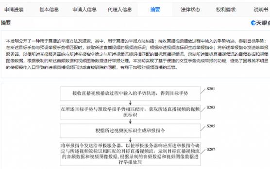 專利摘要顯示,舉報(bào)方法包括:接收直播視頻播放過(guò)程中輸入的手勢(shì)軌跡,得到目標(biāo)手勢(shì);在目標(biāo)手勢(shì)與預(yù)設(shè)舉報(bào)手勢(shì)相匹配時(shí),獲取直播視頻的視頻流標(biāo)識(shí),并生成舉報(bào)指令;將指令發(fā)送給服務(wù)器,服務(wù)器響應(yīng)后,確定目標(biāo)直播視頻流并錄制音視頻數(shù)據(jù),進(jìn)行舉報(bào)處理。本發(fā)明可實(shí)現(xiàn)基于交互手勢(shì)完成舉報(bào)的功能,避免因?qū)ふ也幻黠@的舉報(bào)操作入口導(dǎo)致的違規(guī)直播視頻已過(guò)或者被刪除的問(wèn)題,有利于加強(qiáng)對(duì)視頻直播的監(jiān)管。