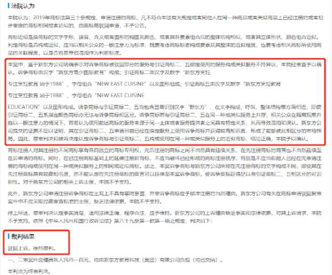 近日,新東方教育科技(集團(tuán))有限公司與國(guó)家知識(shí)產(chǎn)權(quán)局教育行政管理(教育)二審判決書(shū)公布。文書(shū)顯示,此前,一審法院駁回訴爭(zhēng)商標(biāo)(35627322號(hào)“新東方青少?lài)?guó)際教育”)的注冊(cè)申請(qǐng)。新東方公司不服被訴決定,向北京市高級(jí)人民法院提起行政訴訟。二審法院認(rèn)為,訴爭(zhēng)商標(biāo)與引證商標(biāo)“新東方烹飪專(zhuān)注烹飪教育 始于1988”“新東方烹飪教育專(zhuān)注烹飪教育 始于1988”在文字構(gòu)成、呼叫、整體結(jié)構(gòu)等方面相近。最終法院判決駁回上訴,維持原判,該判決為終審判決。