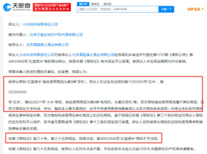 文書詳情顯示,小米科技有限責任公司對北京酒國演義酒業有限公司申請的“紅藍綠米”商標提出異議。商標局審查認為,被異議商標指定使用商品為“耳機”,與異議人引證在先注冊的“紅米”“小米”商標核定使用的“電視機;頭戴式耳機”等屬于類似商品,且雙方商標在文字構成、呼叫、整體含義等方面相近,如予并存使用易使消費者誤認,因此,依據商標法規定,對第48833848號“紅藍綠米”商標不予注冊。