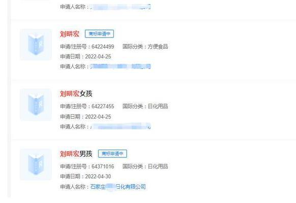 天眼查App顯示,近日,“劉畊宏男孩”商標被石家莊一日化公司申請注冊,國際分類為日化用品,當前商標狀態為申請中。此前,“劉畊宏”“劉畊宏女孩”商標被多個公司搶注,目前這些商標狀態均為申請中。