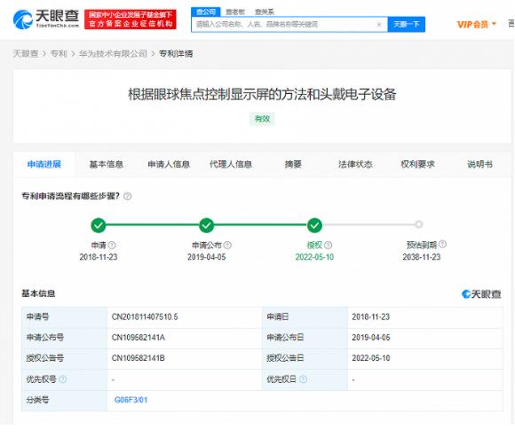 天眼查App顯示,5月10日,華為技術有限公司申請的“根據眼球焦點控制顯示屏的方法和頭戴電子設備”專利獲授權。專利摘要顯示,該方法包括:在顯示屏上顯示圖像,用戶眼球的聚焦焦點在第一距離范圍內;在檢測到用戶眼球聚焦焦點不在第一距離范圍內的持續時長大于或等于第一時長時,關閉顯示屏。實施本申請實施例,可以節省功耗,并減少圖像對觀看現實世界的影響。