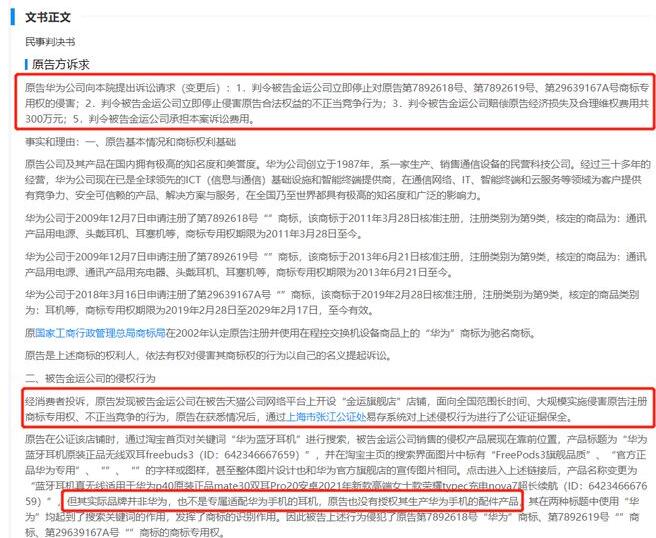 企查查APP顯示,近日,浙江省杭州市余杭區人民法院公布一起侵權華為商標及不正當競爭糾紛的案件。華為技術有限公司經消費者投訴,發現被告深圳市金運視訊設備有限公司在其網店中銷售未經授權的多款華為耳機,面向全國范圍長時間、大規模實施侵害原告注冊的“華為”“HUAWEI”“FREEBUDS”商標專用權。