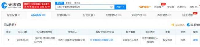 天眼查App顯示,江西江中食療科技有限公司成立于2011年5月,注冊資本約10.48億人民幣,法定代表人劉家清,經營范圍包括預包裝食品的批發零售;保健食品的批發零售等。風險信息顯示,去年9月,該公司因涉及合同糾紛被凍結所持江中食療科技有限公司2億人民幣股權。