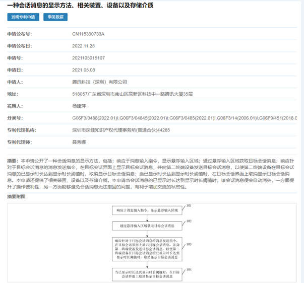 天眼查App顯示,11月25日,騰訊科技(深圳)有限公司申請(qǐng)的“一種會(huì)話消息的顯示方法、相關(guān)裝置、設(shè)備以及存儲(chǔ)介質(zhì)“專利公布。