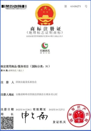 固鎮(zhèn)縣石湖是皖北最大的西瓜集散地,有“西瓜之鄉(xiāng)”的美譽(yù)。石湖西瓜果實(shí)近圓形,皮薄光滑、綠底條紋、有蠟粉、瓜瓤脆嫩呈紅色,味甜多汁,纖維素少,不倒瓤,深受消費(fèi)者喜愛(ài)。該證明商標(biāo)的成功注冊(cè),提升了品牌的知名度和影響力,將使得西瓜產(chǎn)業(yè)提質(zhì)增效步伐不斷加快。
