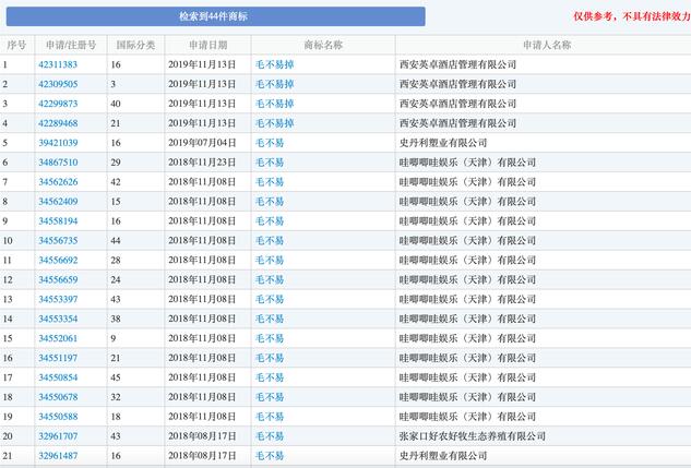 官網(wǎng)顯示,截至2020年7月19日,有關(guān)毛不易的商標申請目前為44件,其中,申請人為哇唧唧哇娛樂(天津)有限公司的申請只有14件,還有5件為霍爾果斯哇唧唧哇娛樂文化有限公司申請,其余25件均來自于其他公司。